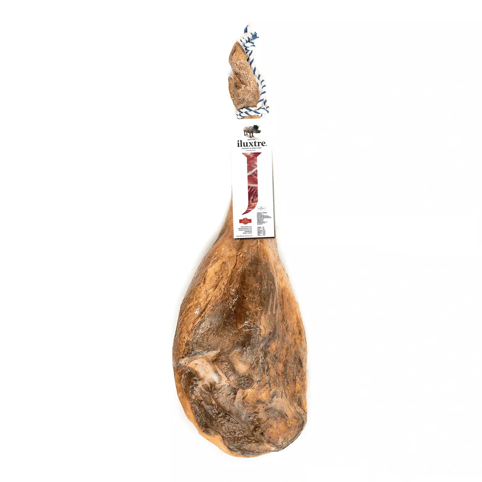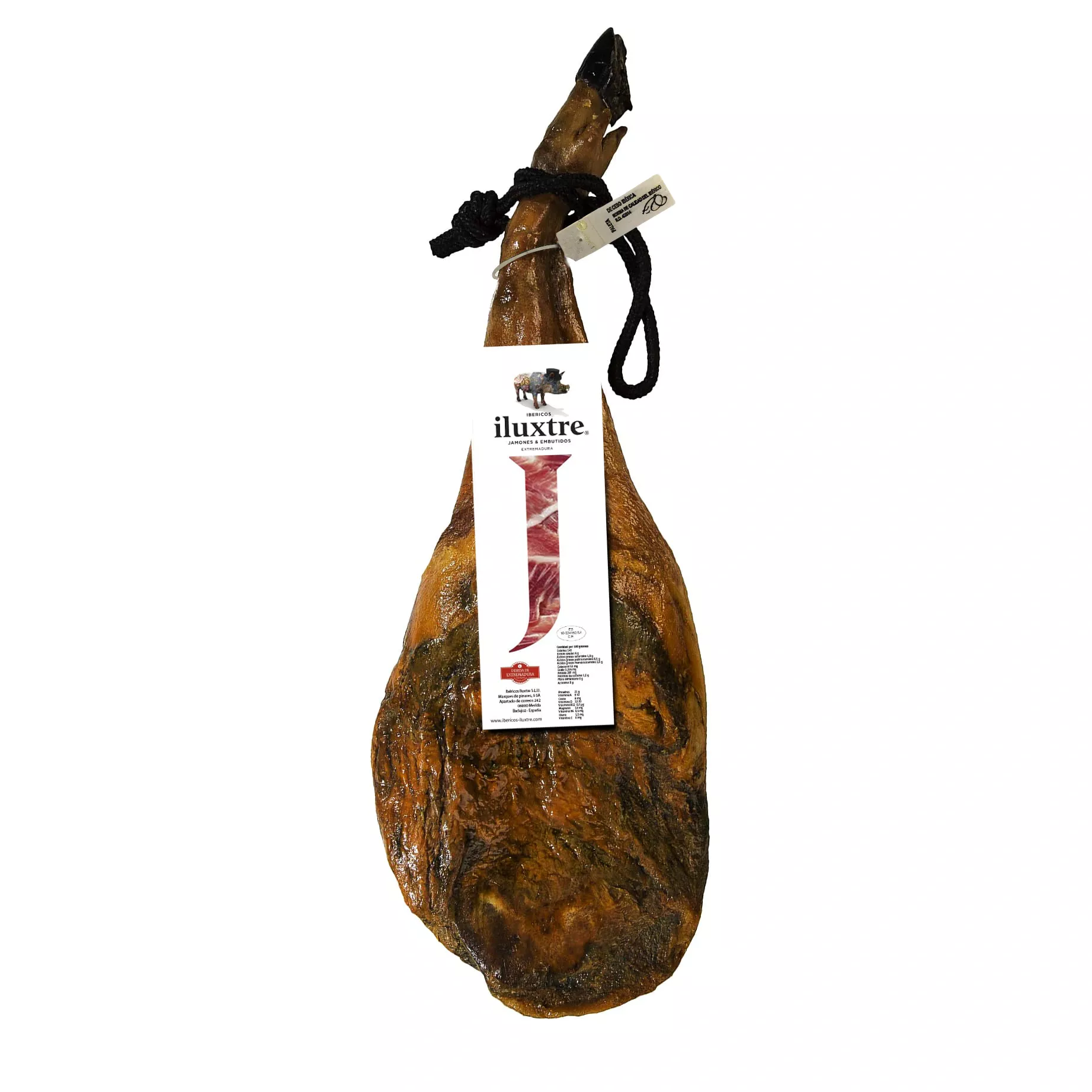 Jamón Ibérico Cebo 50% Raza Ibérica Iluxtre Brida Blanca: Una joya culinaria de Extremadura. Con un 50% de raza ibérica, este jamón se distingue por su sabor profundo y textura suave, resultado de una curación mínima de 36 meses. Un producto 100% extremeño, madurado a la perfección y listo para deleitar tus sentidos.