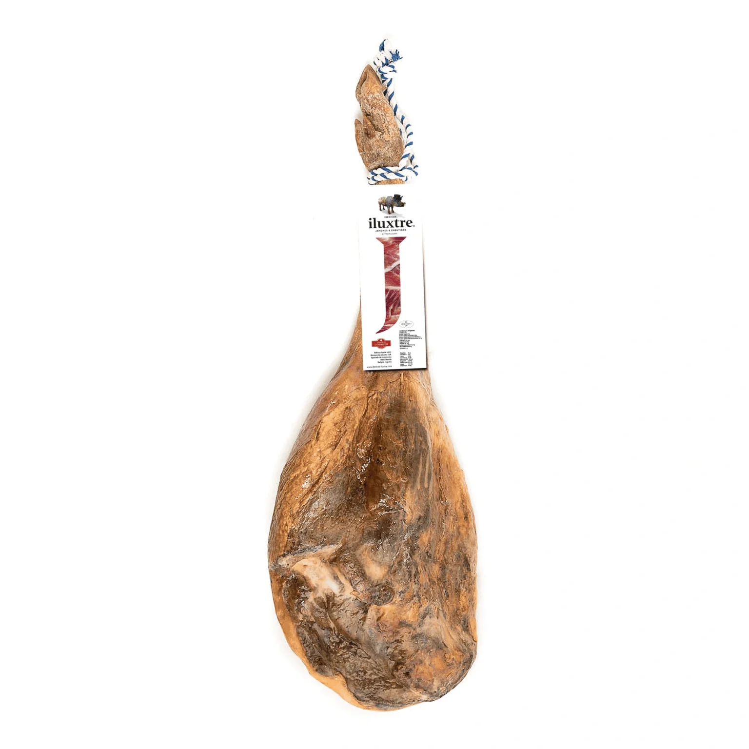 Jamón Ibérico Cebo 50% Raza Ibérica Iluxtre Brida Blanca: Una joya culinaria de Extremadura. Con un 50% de raza ibérica, este jamón se distingue por su sabor profundo y textura suave, resultado de una curación mínima de 36 meses. Un producto 100% extremeño, madurado a la perfección y listo para deleitar tus sentidos.